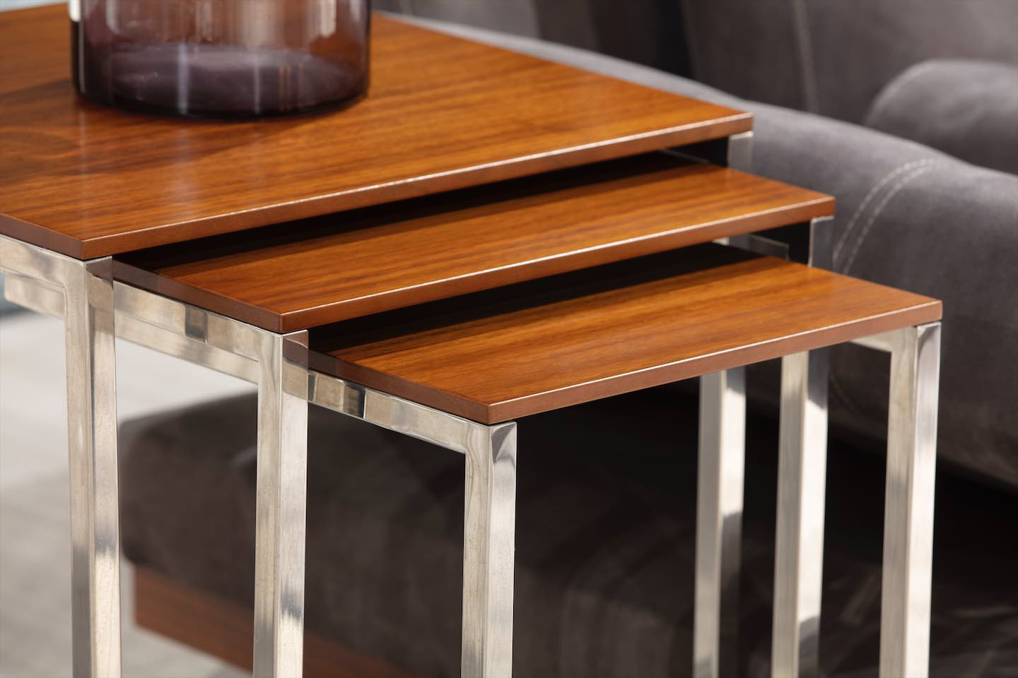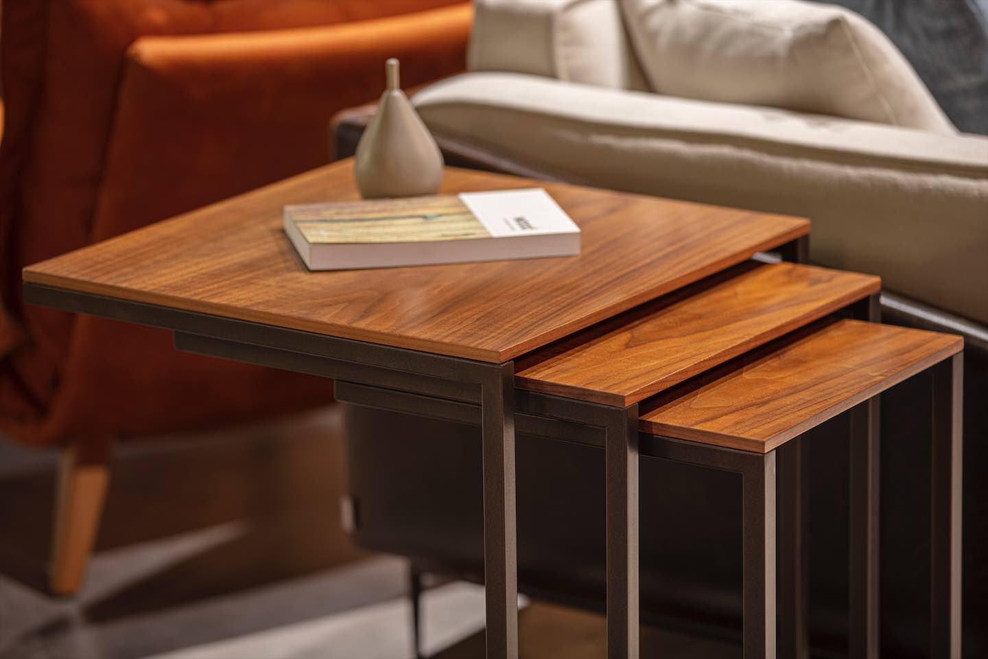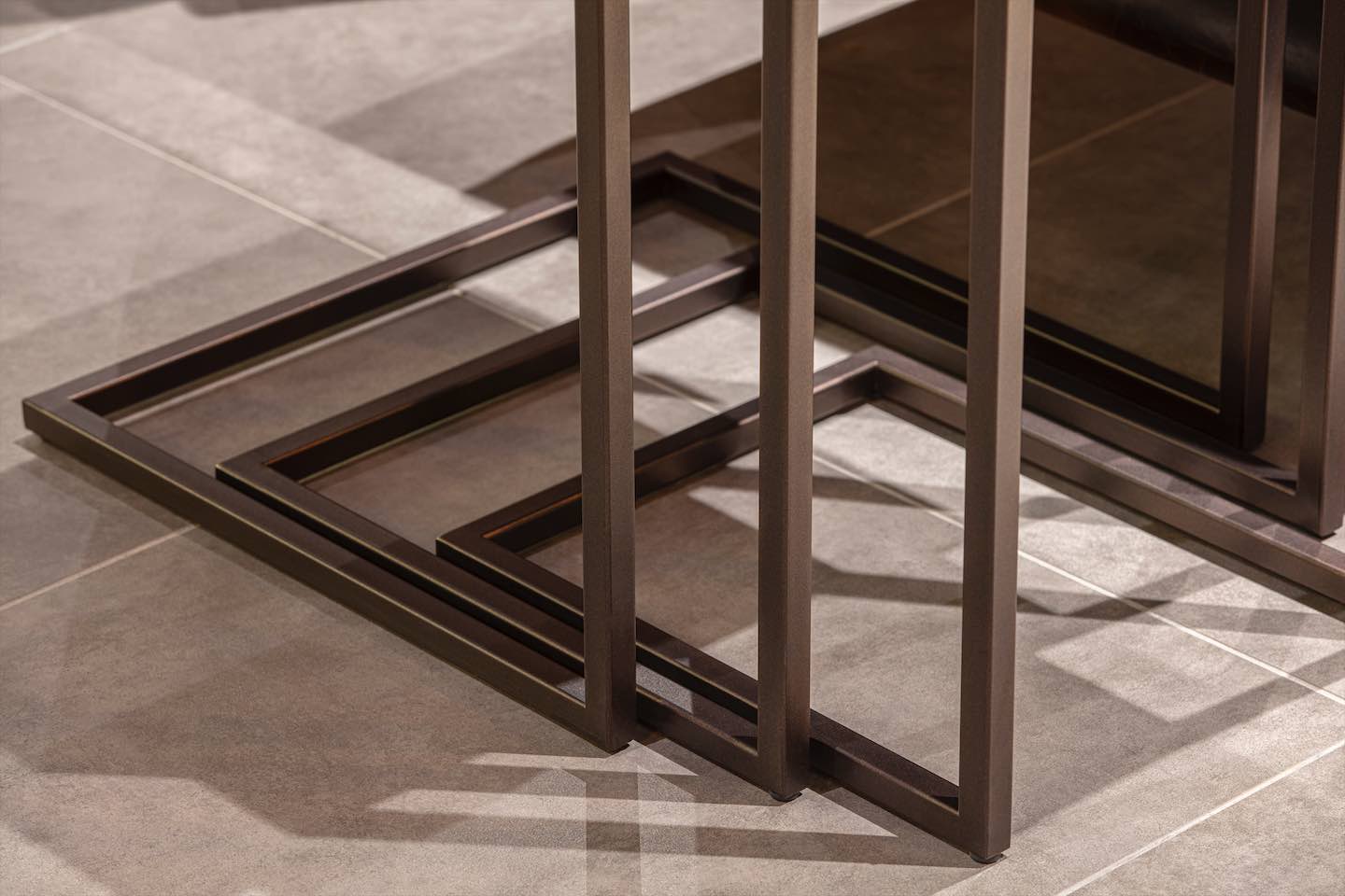 KROMA kännetecknas av sina rena, geometriska former och balanserade proportioner. De två bordens nesting-design gör det möjligt att spara plats när de inte används, eller att bredda ytan genom att dra ut det mindre bordet vid behov. Det skapar både praktiska och dekorativa möjligheter i rummet, oavsett om du placerar dem intill soffan, fåtöljer eller som separat accentmöbel.
