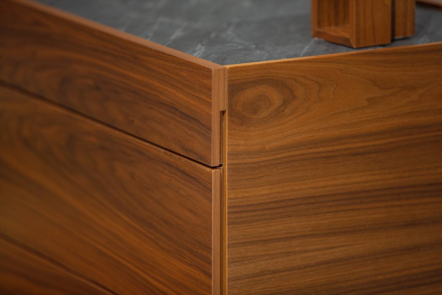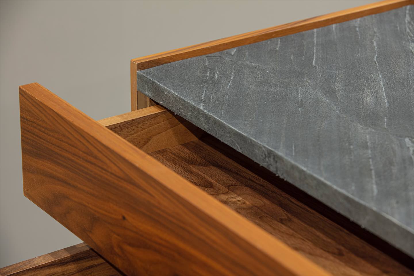 LAV hög byrå speglar passionen i LAV-serien genom sin harmoniska kombination av naturliga material och design som för naturens spår in i ditt sovrum. Den uppskattas särskilt av dig som värdesätter varierade inredningsstilar utan att kompromissa med naturlighet, och som fascineras av den unika skifferstenen på bordsskivan.