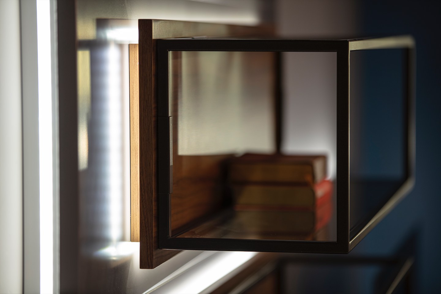 LOFT utmärks av sin arkitektoniska karaktär där trähyllor framhävs av metallramar som kontrasterar mot den råa bakgrundsytan. Den öppna, asymmetriska designen gör enheten till ett blickfång samtidigt som den erbjuder praktisk plats för mediautrustning, böcker och dekorativa föremål.