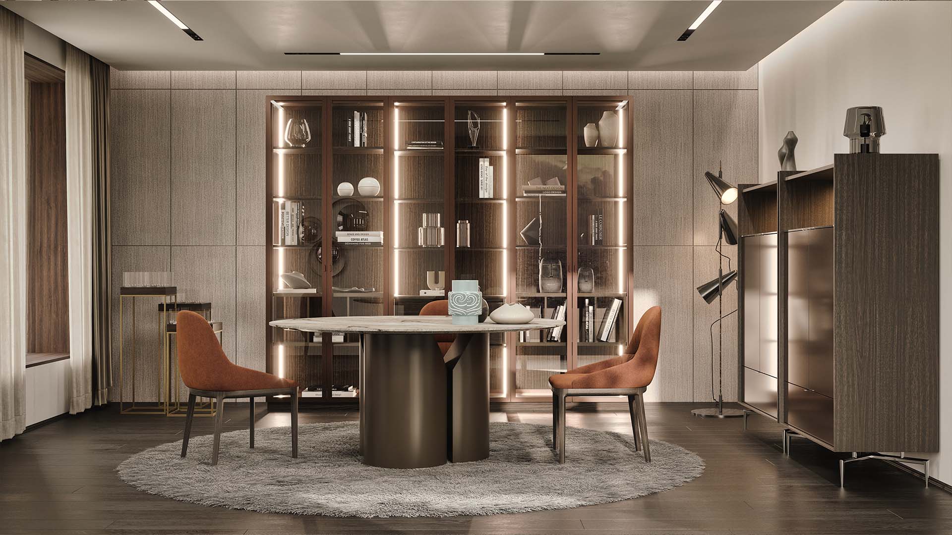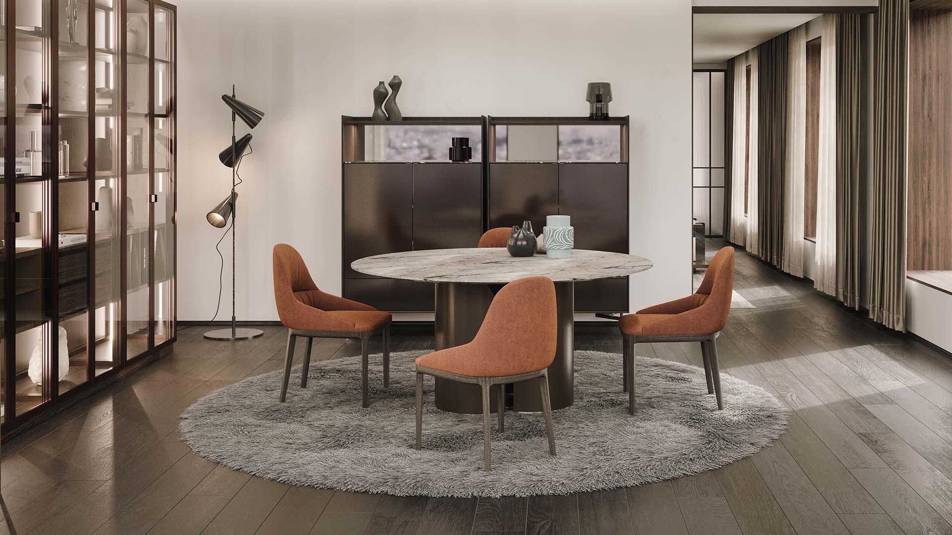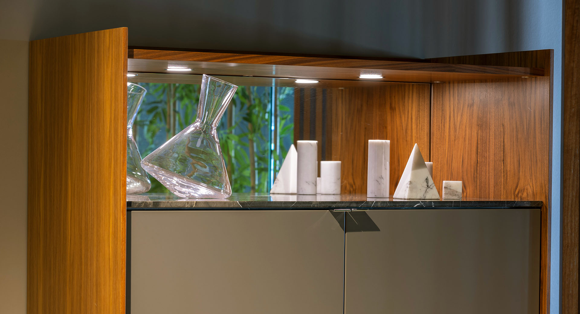 Den höga profilen hos MEST ger en skulptural närvaro utan att ta upp för mycket golvyta. Dörrarna och luckorna är placerade för att skapa harmoni i uttrycket, medan den inre inredningen möjliggör flexibel lagring för tallrikar, glas, böcker eller dekorativa föremål.
