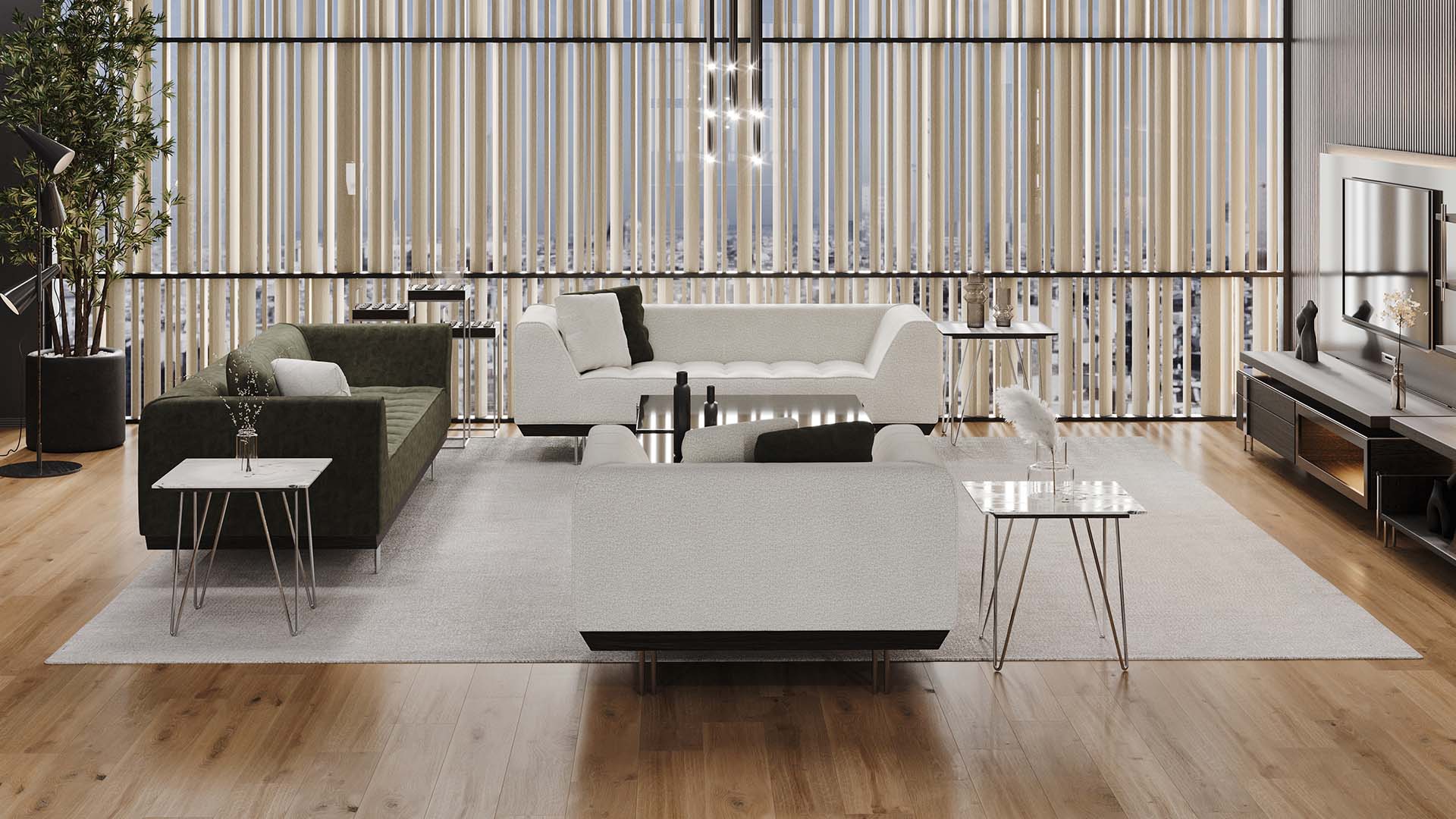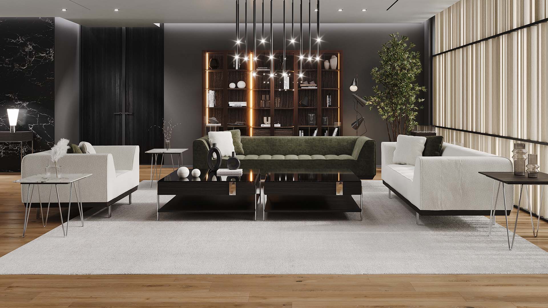 Lounge / fåtöljgrupp: För att ge balans åt sittplatser och dekor.