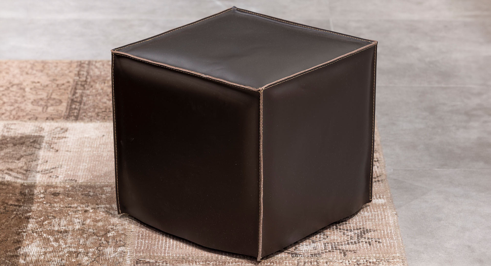 Puffens kubform ger ett stramt men inbjudande uttryck, och de dekorativa sömmarna tillför både karaktär och visuell textur. Den blir en stilfull sittplats, fotpall eller accentmöbel – beroende på hur du vill använda den.